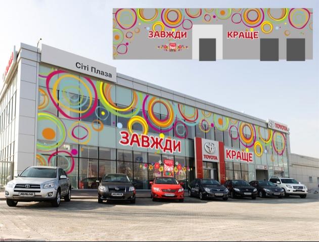 Проведені роботи: оклейка фасаду автосалону, оклейка автомобилю, виробництво та монтаж банера, поставка повітряних кульок, друк та поклейка стікера на підлогу під два автомобіля.